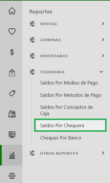 - Accedé al panel de gestión: Ingresá a tu sistema y, desde el menú lateral izquierdo, dirigite a la sección Reportes, seleccioná Tesorería -> Saldos por Chequera.