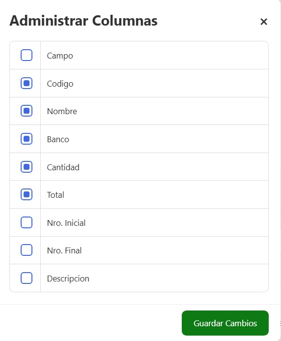 - Cantidad Disponible: Cantidad de cheques aún disponibles (no usados).