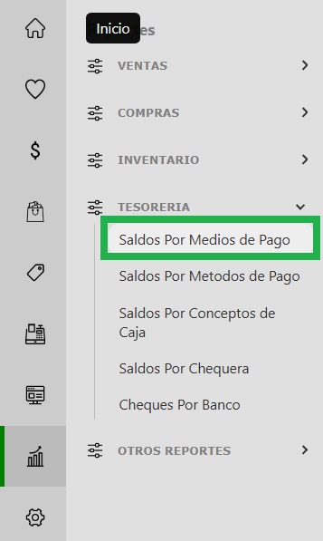 - Accedé al panel de gestión: Ingresá a tu sistema y, desde el menú lateral izquierdo, dirigite a la sección Reportes, seleccioná Tesorería -> Saldos por Medios de Pago.