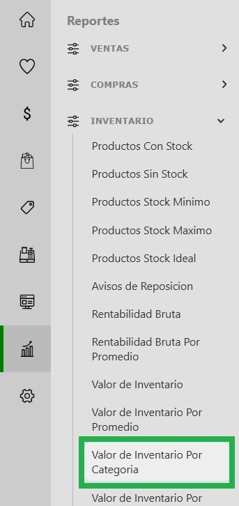 - Accedé al panel de gestión: Ingresá a tu sistema y, desde el menú lateral izquierdo, dirigite a la sección Reportes, seleccioná Inventario -> Valor de Inventario por Categoría.
