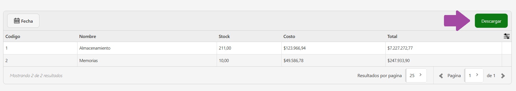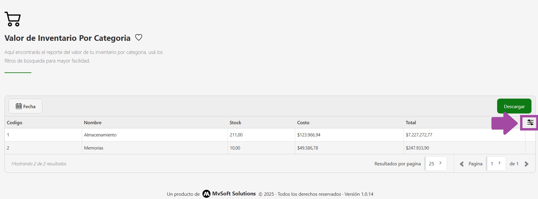 - Filtro por Fecha: Te permite generar el reporte en función de una fecha o período específico. Esto es útil para auditorías mensuales, cierres de ejercicio o comparativas históricas. Por ejemplo, podés ver cuánto valía tu inventario en una categoría específica al 31/12 del año anterior.