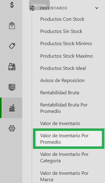 - Accedé al panel de gestión: Ingresá a tu sistema y, desde el menú lateral izquierdo, dirigite a la sección Reportes, seleccioná Inventario -> Valor de Inventario por Promedio.
