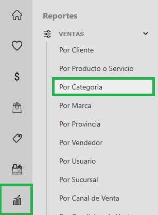 - Accedé al panel de gestión: Ingresá a tu sistema y, desde el menú lateral izquierdo, dirigite a la sección Reportes, seleccioná Ventas -> Por categoría.