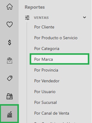 - Accedé al panel de gestión: Ingresá a tu sistema y, desde el menú lateral izquierdo, dirigite a la sección Reportes, seleccioná Ventas -> Por marca.
