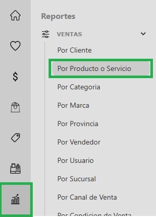 Ingresá a tu sistema y, desde el menú lateral izquierdo, dirigite a la sección Reportes, seleccioná Ventas → Por producto o servicio.