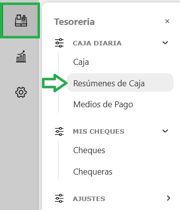 Para ver los resúmenes de cajas que ya fueron cerradas ingresa en el panel de funciones que se encuentra a la izquierda, en el módulo Tesoreria ➜ Caja diaria ➜ Resumenes de caja.
