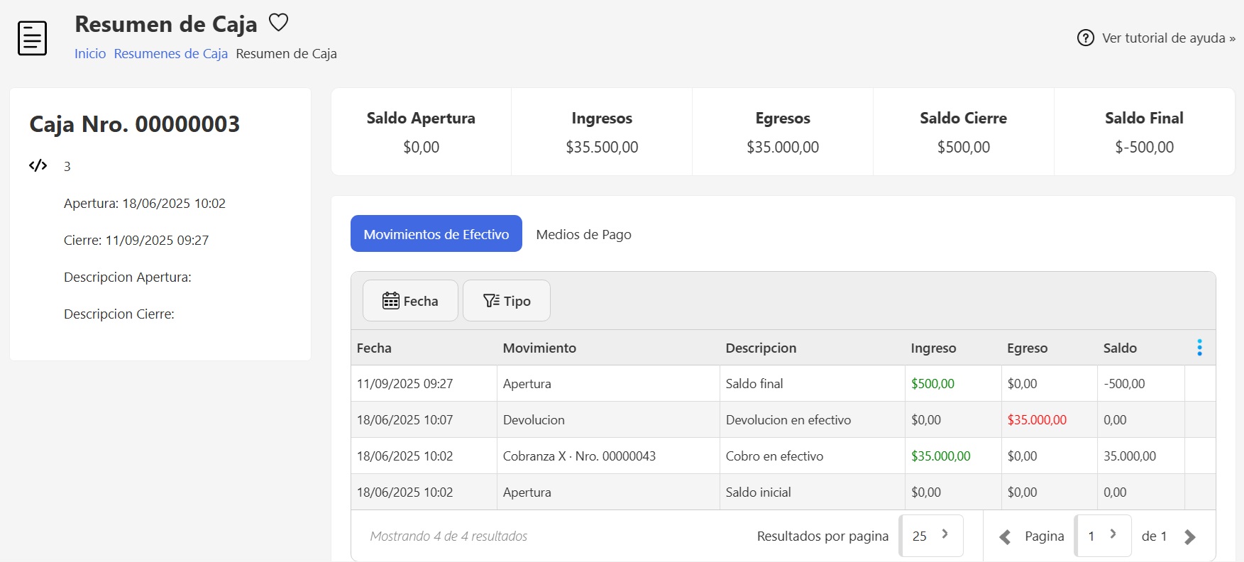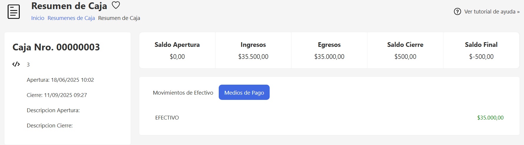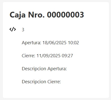 Al ingresar al resumen de caja vas a encontrar en la parte izquierda sus datos principales: código, número, fecha y hora de apertura, cierre y descripciones.