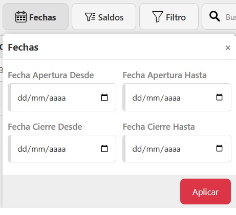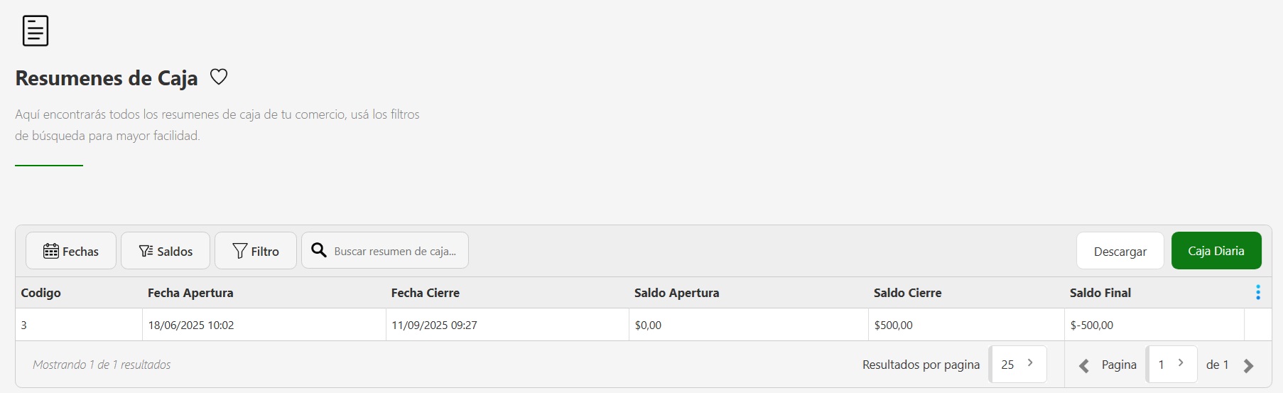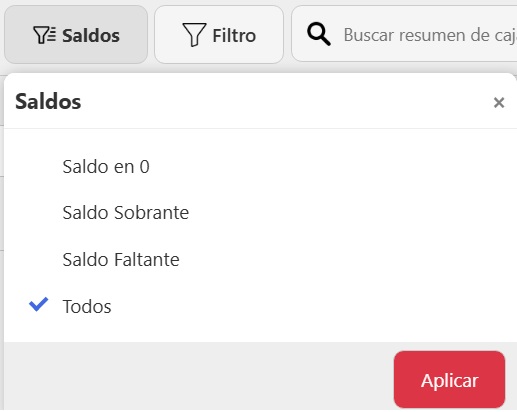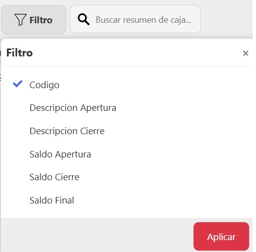 Una vez accedas, vas a ver el listado de todos los resumenes de caja con los datos de Fecha de Apertura, Fecha de Cierre, Saldo de apertura, Saldo de Cierre y Saldo Final. Para hacer una búsqueda específica, podés usar los siguientes filtros: