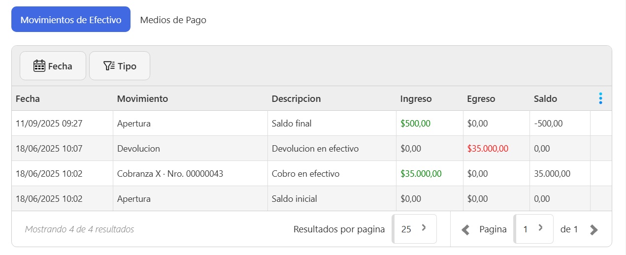 Muestra las operaciones realizadas en efectivo, indicando fecha, movimiento, descripción, ingreso, egreso y saldo.Medios de Pago