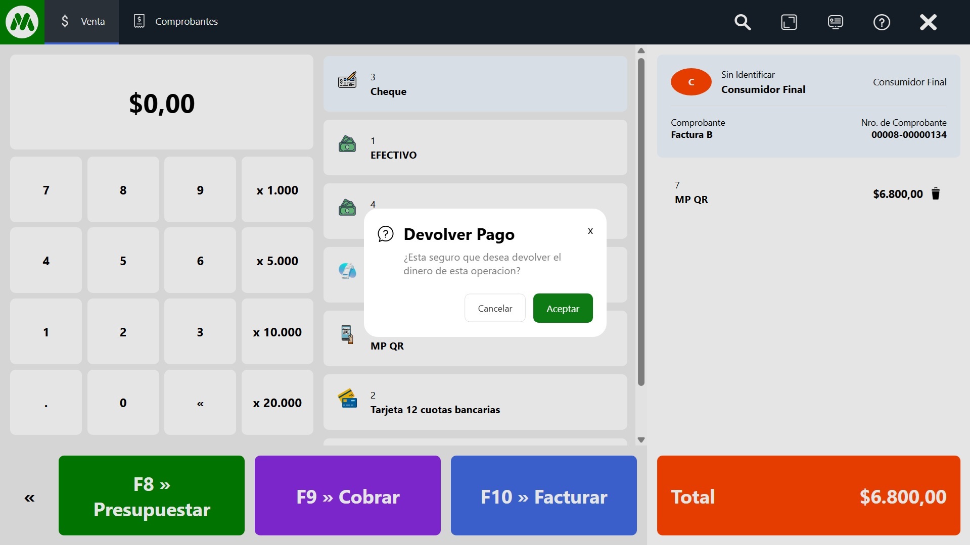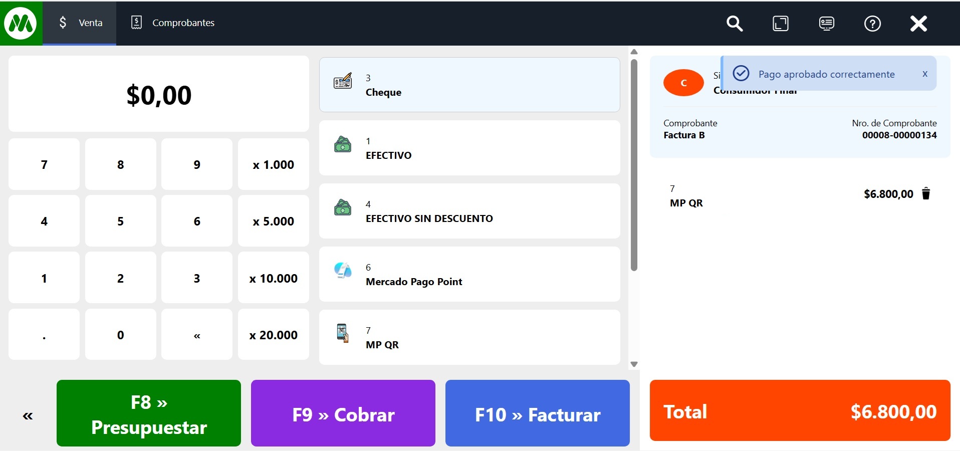 Finalizar operación: Si todo está correcto, para completar la venta seleccioná Cobrar o Facturar.