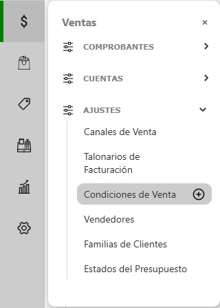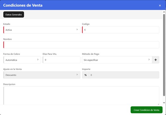 Seleccioná el botón "+" en la sección Condiciones de Venta para crear una nueva