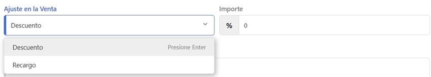 Ajuste en la Venta: Ésta opción está solo disponible para la forma de cobro En Cuenta, ya que la formas de cobro tanto “Automática” como “Manual” los descuentos o recargos dependen del Medio de Pago correspondiente. Para aplicar descuentos o recargos selecciona lo que corresponda y en la parte “Importe” poner el porcentaje.
