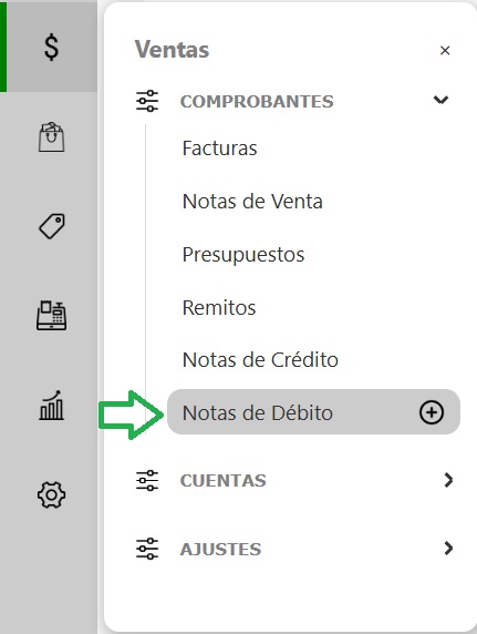 Para realizar la búsqueda de Notas de Débito emitidas tenés que ingresar al módulo Ventas que se encuentra en el panel principal izquierdo y luego en Comprobantes y seleccionar Notas de Débito.