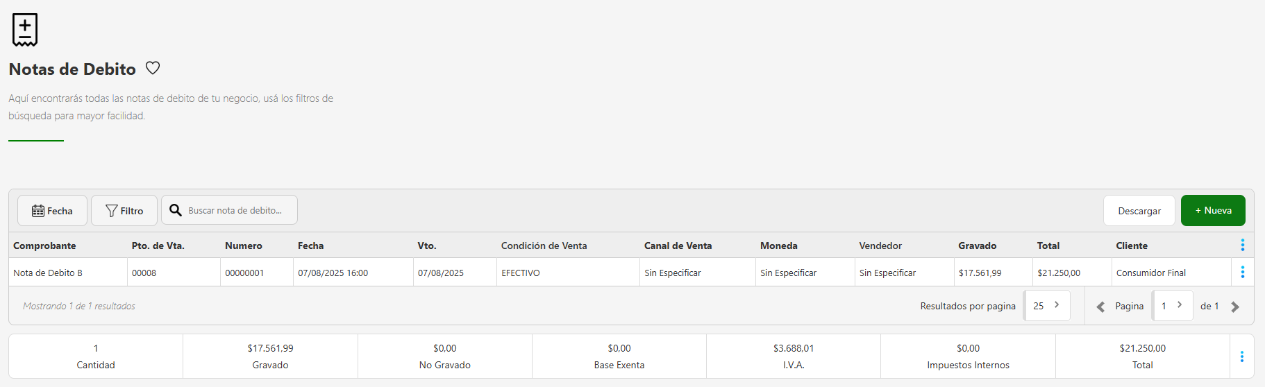 Una vez ingreses, el sistema te mostrará el listado de todas las notas de débito emitidas.