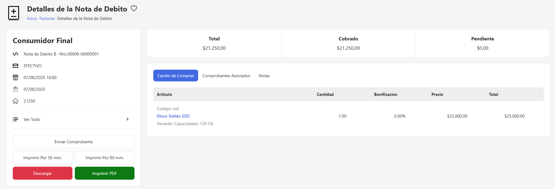Desde esta pantalla podés consultar toda la información relacionada con una Nota de Débito generada: cliente, estado, artículos facturados, montos cobrados, formas de impresión y opciones de descarga. Accedé a esta opción haciendo clic directamente desde el listado de notas de débito, o desde los 3 puntos Opciones -> Ver Factura.