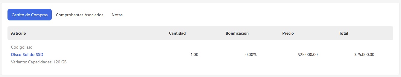 En la parte derecha vas a ver el contenido del Carrito de Compras, con los siguientes datos por cada artículo: