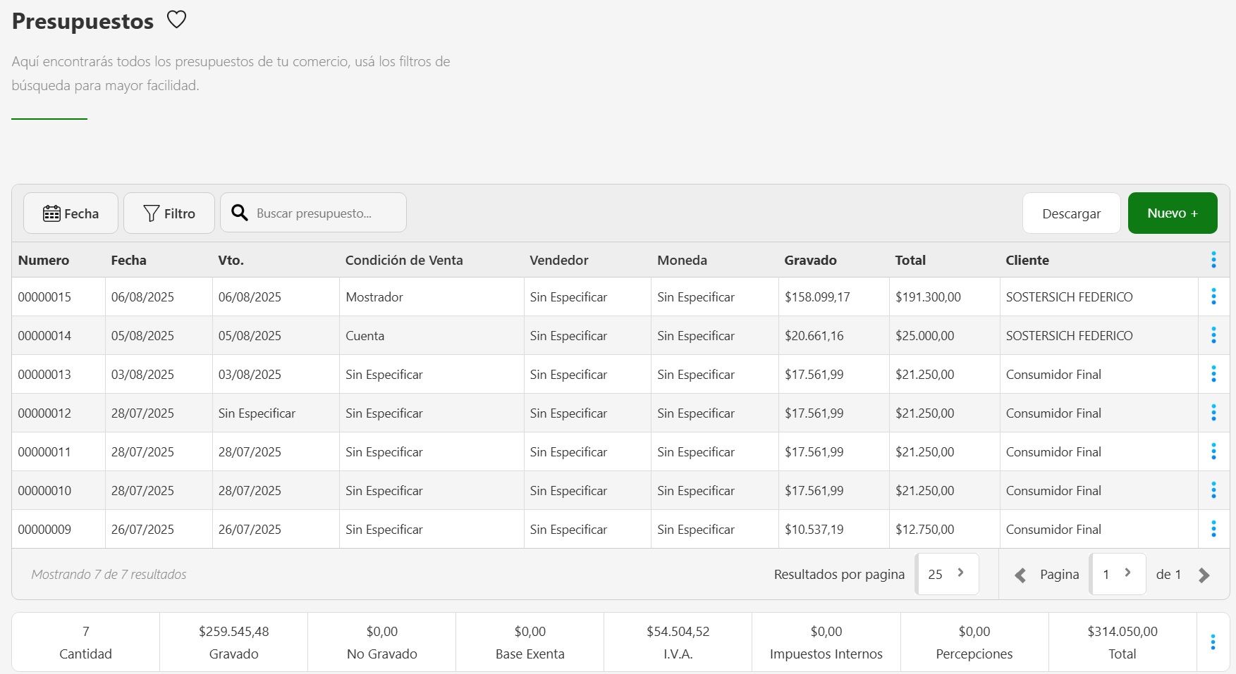 Una vez ingreses el sistema te mostrará el listado de todas los Presupuestos emitidos
