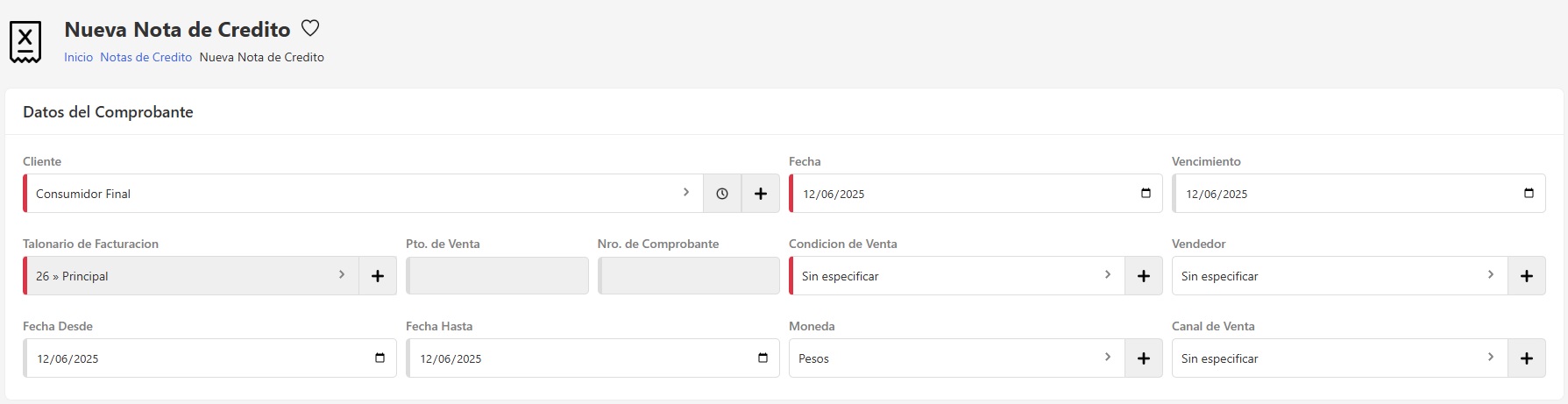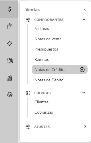 Seleccioná el botón "+" al lado de Notas de Crédito para crear un nuevo comprobante