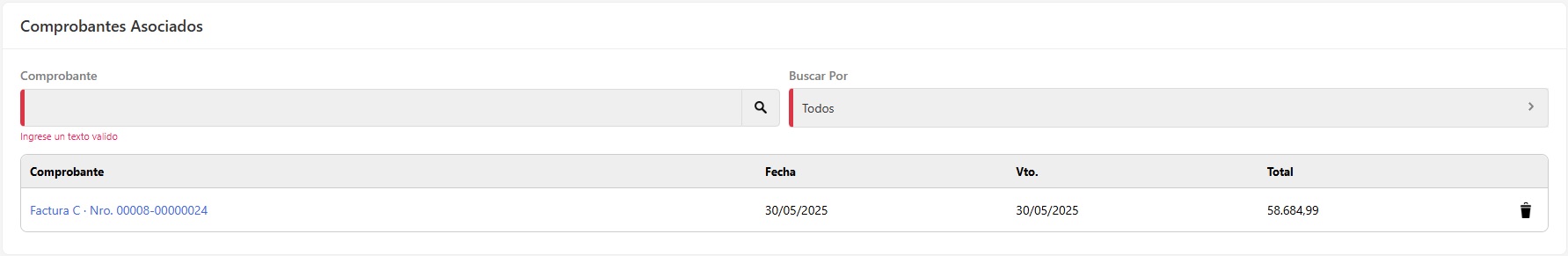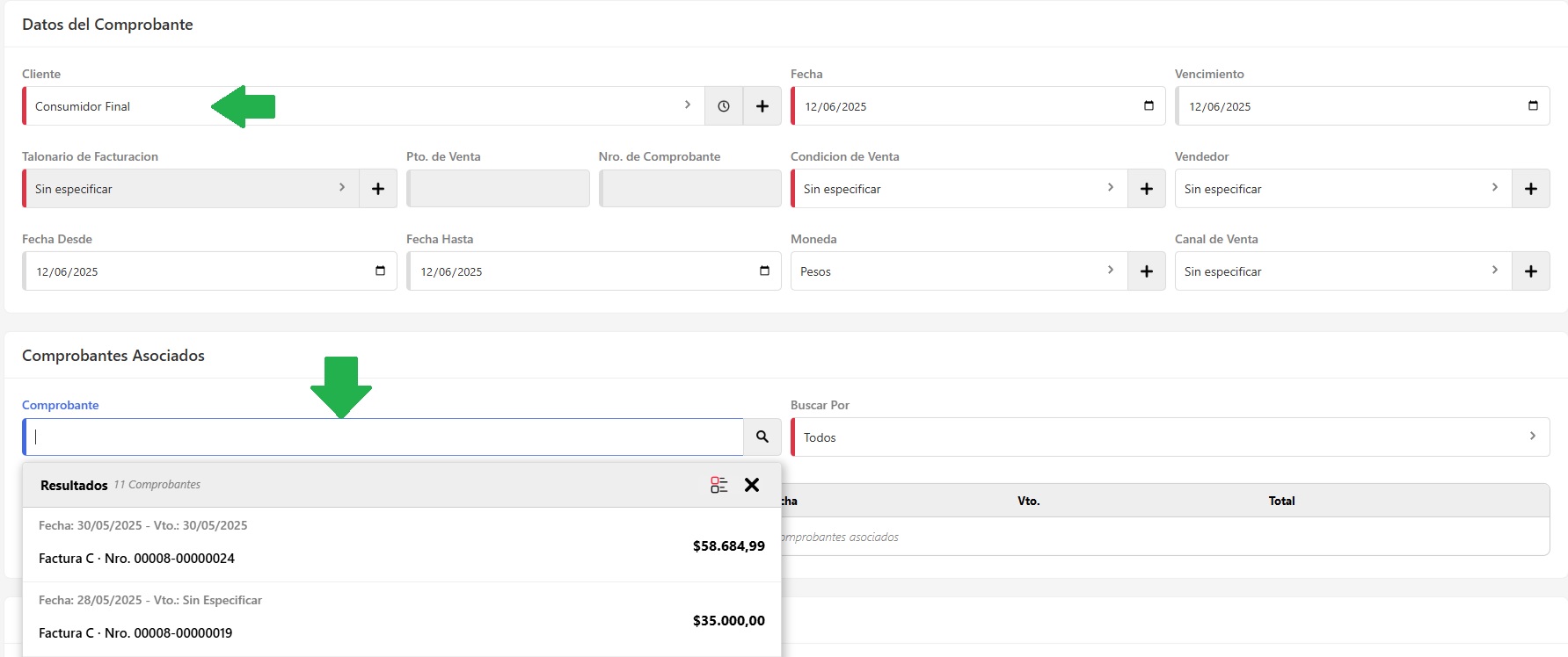 En la sección Comprobantes Asociados dale clic y tecla Enter y se desplegarán todos los comprobantes emitidos a esa cuenta, también podés realizar una búsqueda personalizada por: