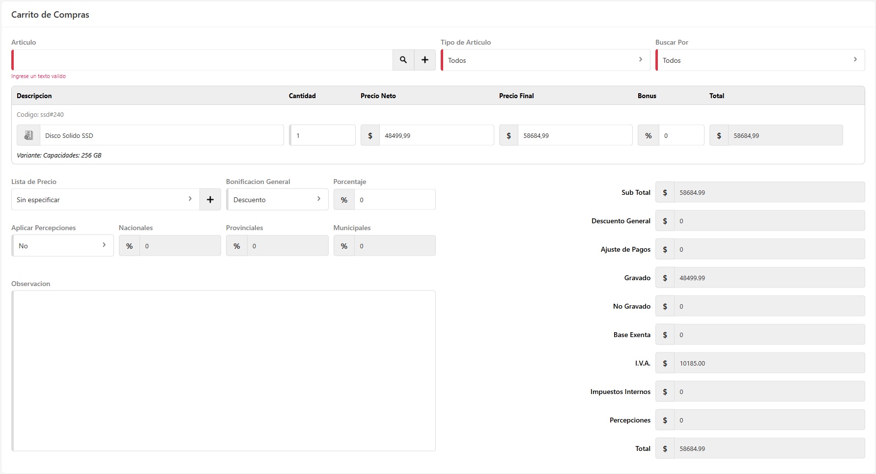 Una vez cargados los artículos, podés cambiar la cantidad y el precio manualmente.